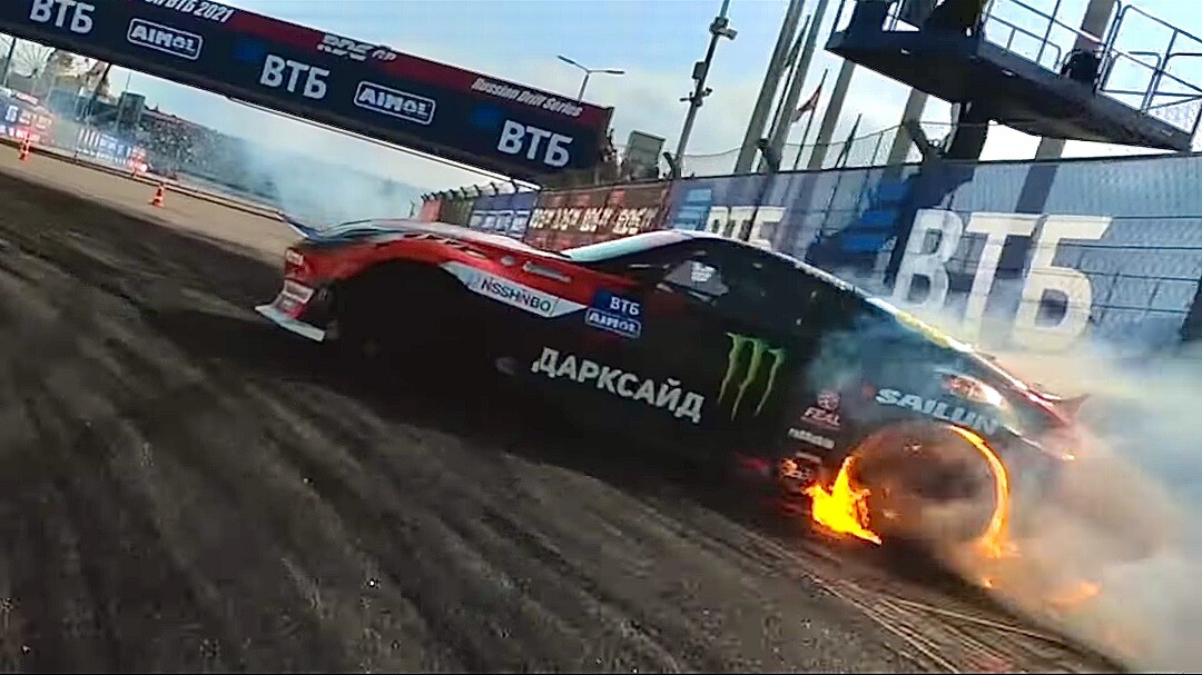 Acaba la carrera con su coche en llamas (Vídeo)